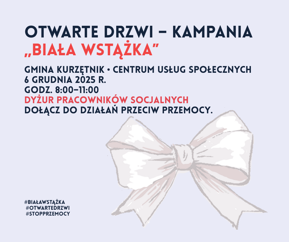 W ramach ogólnoświatowej kampanii „Biała Wstążka” Gmina Kurzętnik oraz Centrum Usług Społecznych zapraszają na „Otwarte Drzwi”, które odbędą się 6 grudnia 2025 r. w godzinach 8:00–11:00. Podczas wydarzenia dostępny będzie dyżur pracowników socjalnych, którzy udzielą informacji, wsparcia i porad związanych z przeciwdziałaniem przemocy.