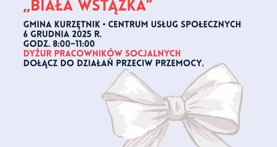 W ramach ogólnoświatowej kampanii „Biała Wstążka” Gmina Kurzętnik oraz Centrum Usług Społecznych zapraszają na „Otwarte Drzwi”, które odbędą się 6 grudnia 2025 r. w godzinach 8:00–11:00. Podczas wydarzenia dostępny będzie dyżur pracowników socjalnych, którzy udzielą informacji, wsparcia i porad związanych z przeciwdziałaniem przemocy.